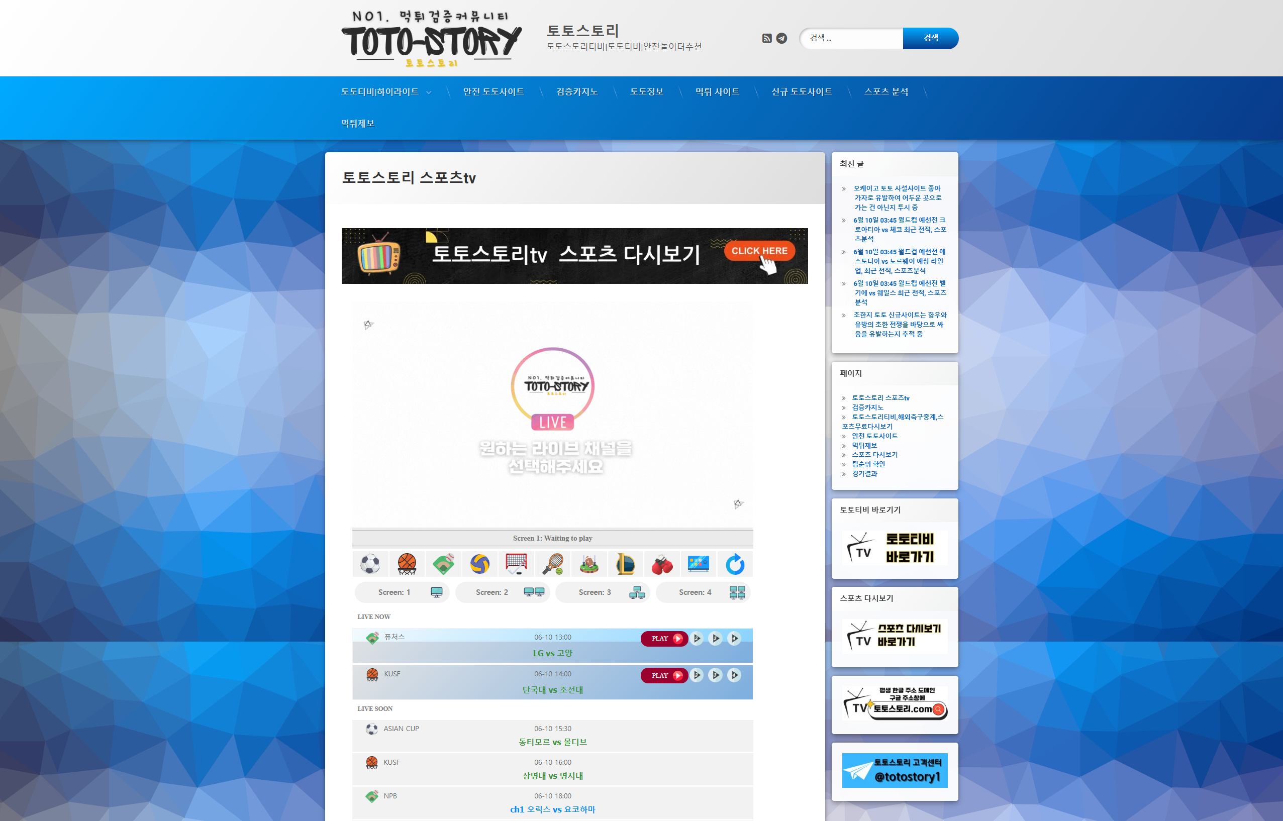 스포츠 중계부터 분석, 하이라이트까지! 토토스토리에서 모두 즐기세요스포츠 실시간 중계 : 토토스토리는 전 세계 다양한 스포츠 경기를 고화질로 실시간 중계합니다. 끊김 없는 환경에서 스포츠 팬이라면 누구나 만족할 만한 경험을 제공합니다.토토스토리TV